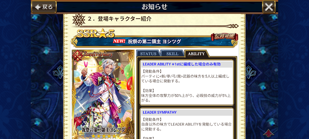 リーダーアビリティの発動条件は、武器種が<斬/拳/弓/魔>の5人を編成するという比較的簡単なものです。