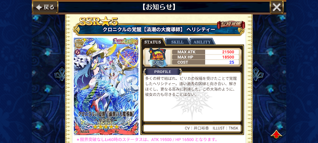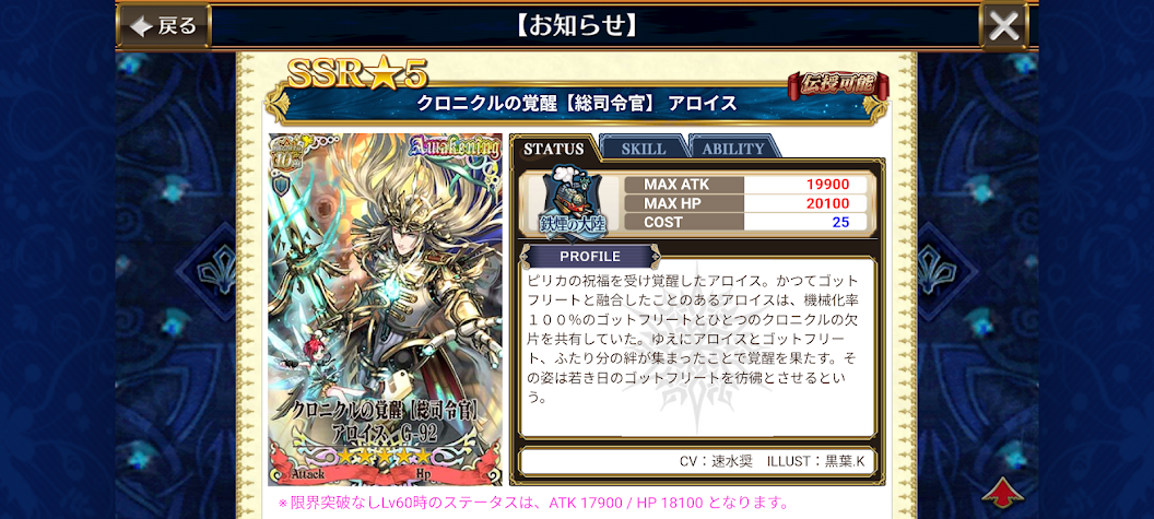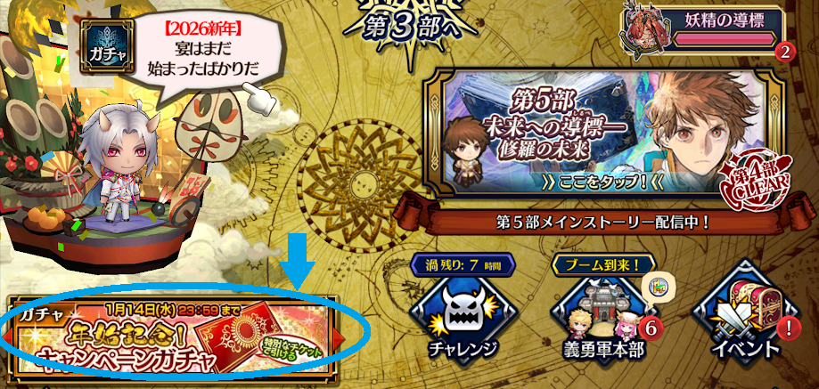 上でご紹介した「クロニクルの覚醒」キャラクター確定のガチャチケットは、こちらの新年を記念したクエストで配布されます。このキャラクターはゲットしていきたいです。