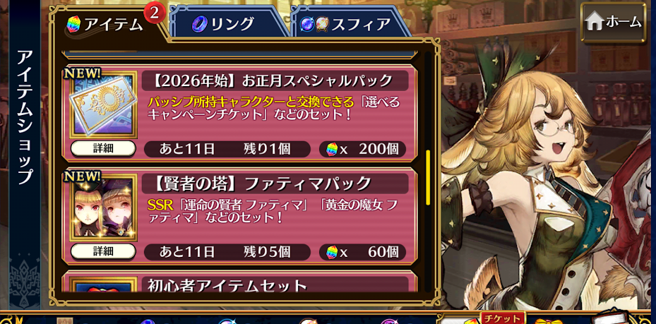 上でご紹介しているパッシブ所持キャラクターと交換可能なチケットなどが含まれたパックです。このチケットは新年や周年のキャンペーンイベントで、今までも配布されていますので、無理に購入する必要は無いと思います。