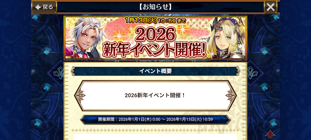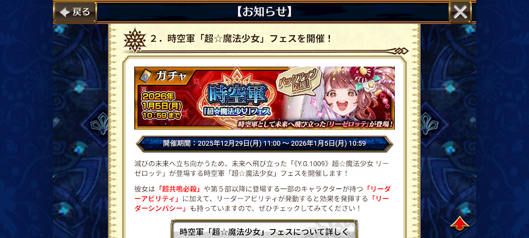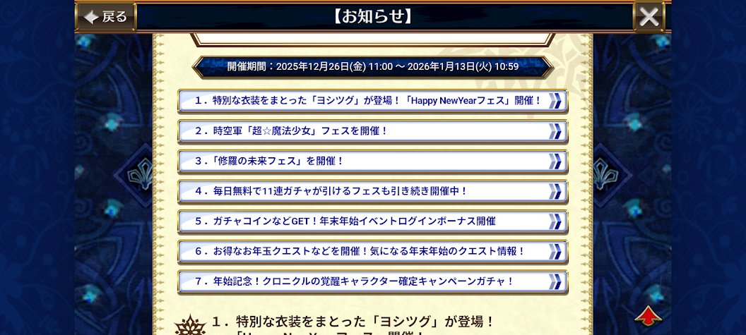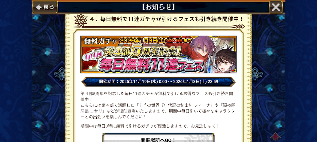2025年から引き続き、無料で11連ガチャが引けるフェスが開催されています。