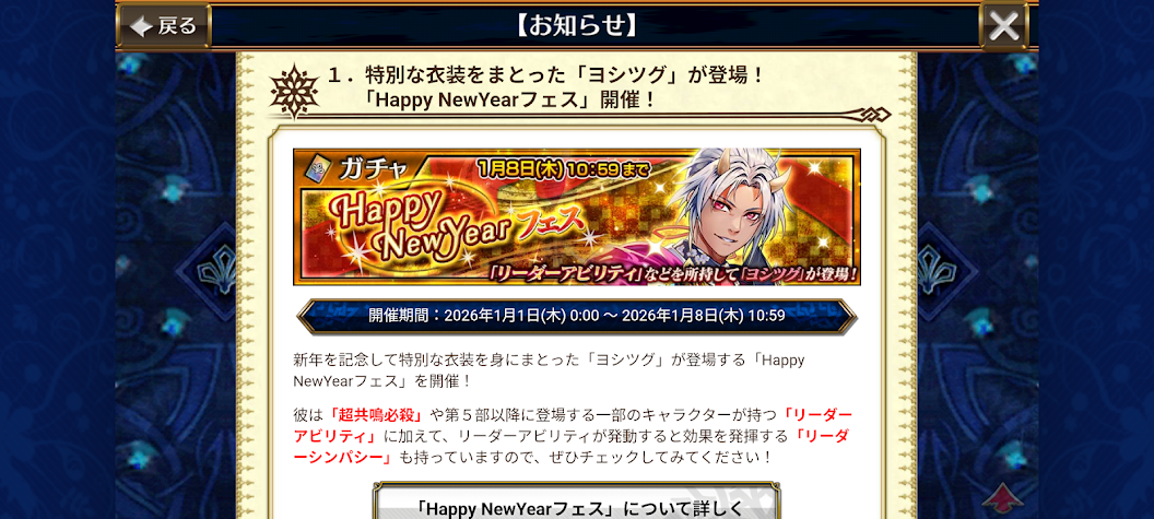 特別な衣装をまとった「ヨシツグ」が登場する「HappyNewYear」フェスが開催されています。
