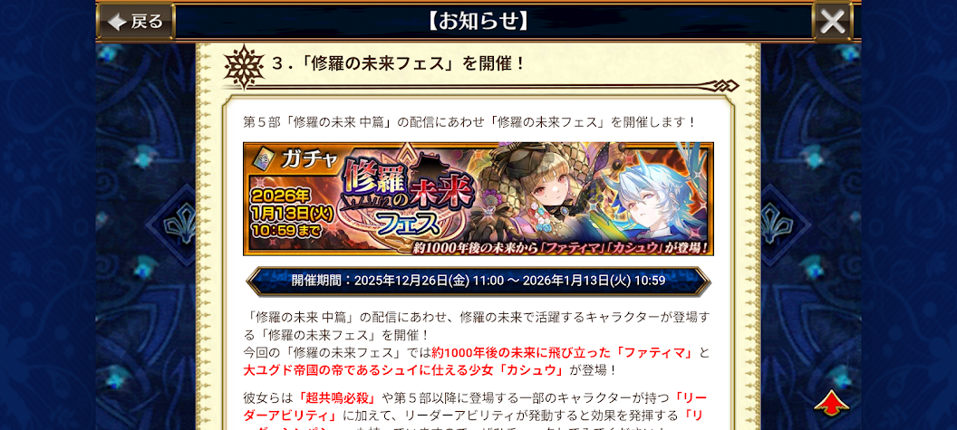 修羅の未来で活躍するファティマとカシュウが排出される「修羅の未来」フェスが年末から引き続き開催されています。