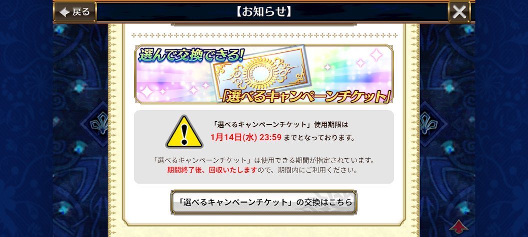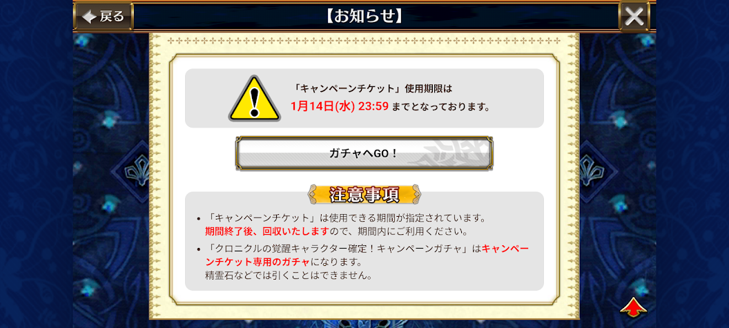 ガチャチケットの期限は1月14日までなので、忘れずに引きたいです。