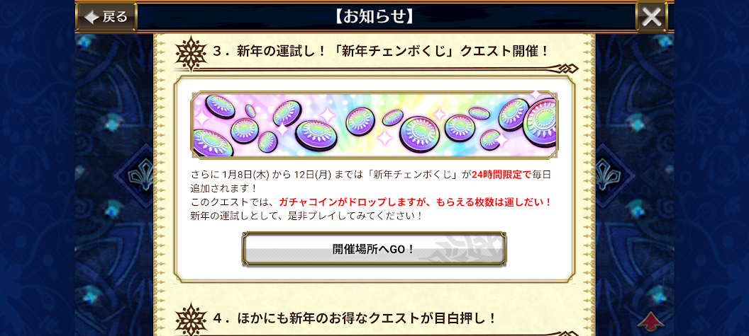 1月8日~12日まではガチャコインのドロップする「新年チェンボくじ」クエストが開催されます。