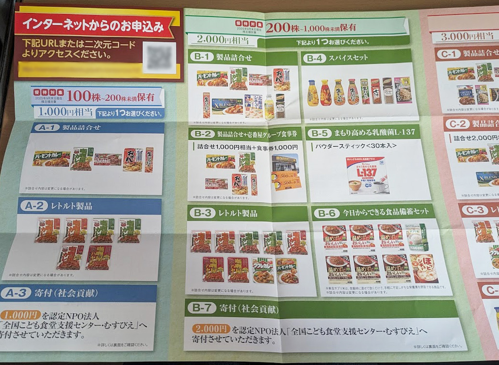 カレールゥなど調味料セットは残りがちだし、レトルトは同じ物が来る事になるので(ワガママ)、100株足して200株に増やしました。